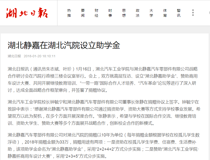 【湖北日报】湖北静嘉在湖北汽院设立助学金